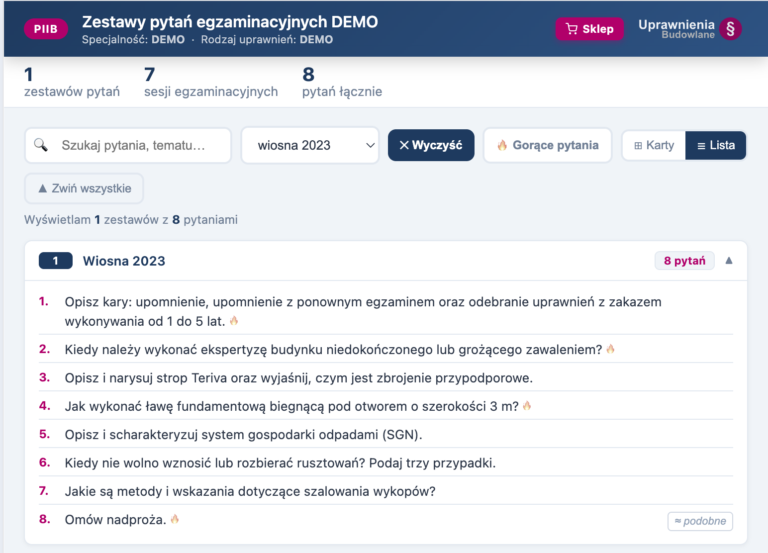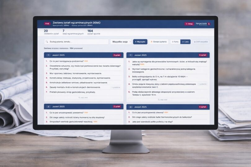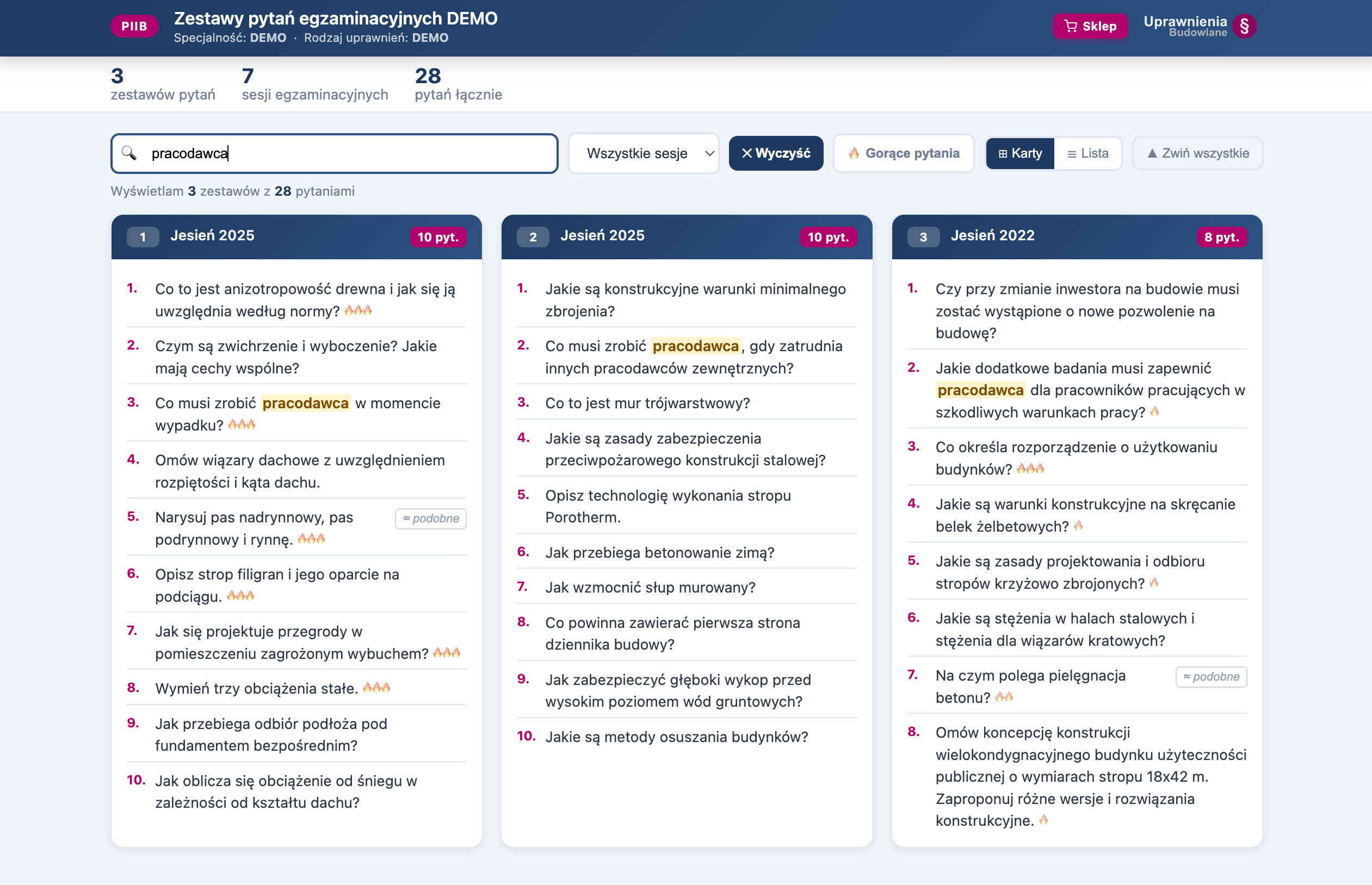 Zanim kupisz — przetestuj. Wersja demo zawiera 20 autentycznych zestawów pytań z egzaminów ustnych PIIB w specjalności KB. Przeglądaj karty zestawów, szukaj konkretnych zagadnień i sprawdź, które pytania pojawiają się najczęściej — oznaczone 🔥 na podstawie analizy zestawów egzaminacyjnych.