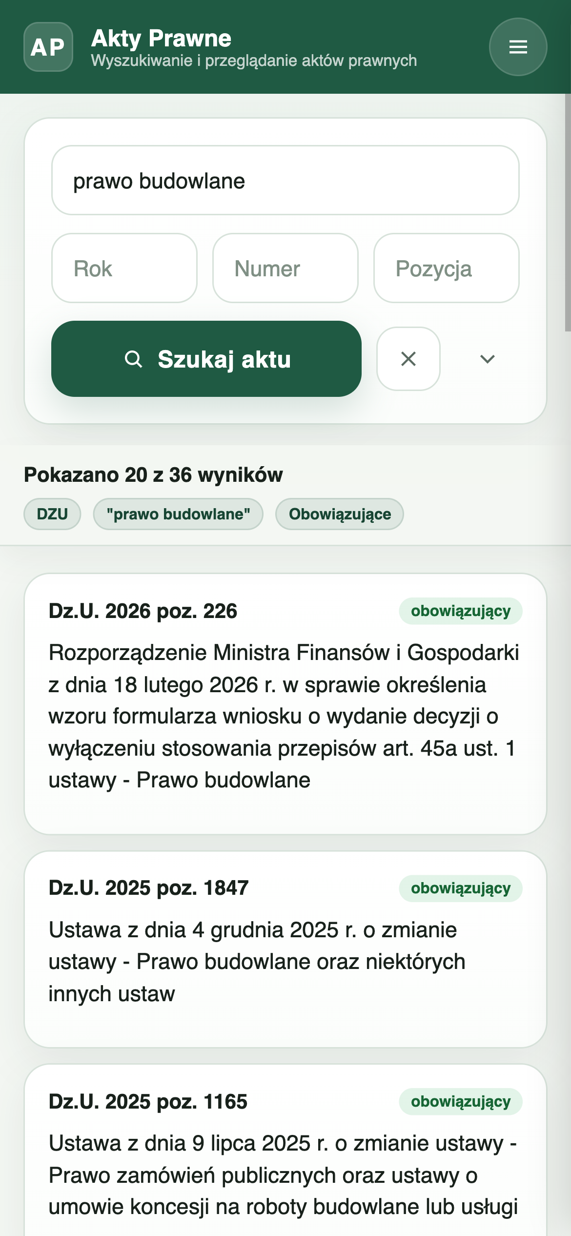 Akty Prawne to aplikacja, która porządkuje proces wyszukiwania i przeglądania dokumentów prawnych na urządzeniu mobilnym. Zamiast ręcznie przechodzić przez kolejne serwisy i wpisywać dane w wielu miejscach, użytkownik dostaje jeden prosty interfejs z wyszukiwarką, wynikami, kartą szczegółową, relacjami między aktami i wygodnym podglądem PDF wewnątrz aplikacji.