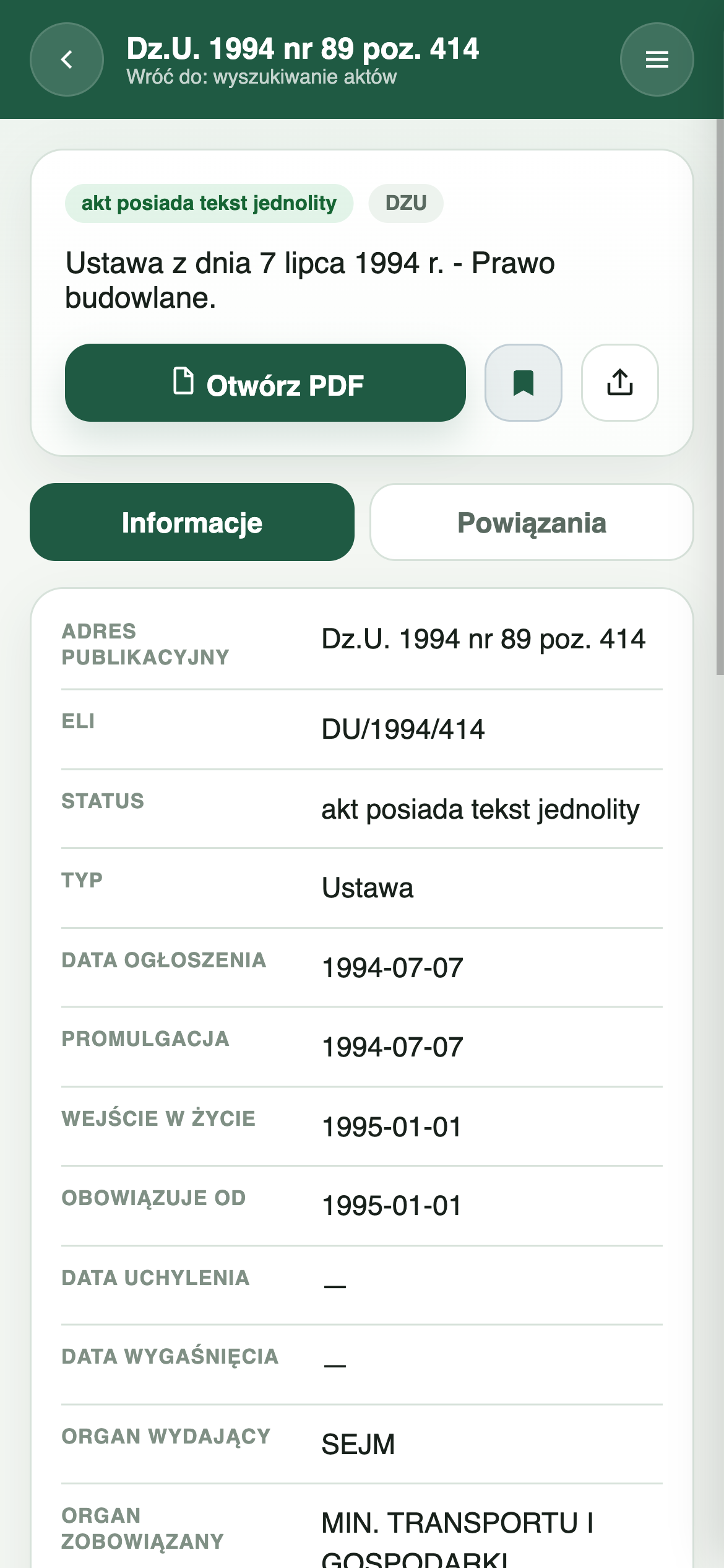 Po znalezieniu aktu użytkownik może od razu otworzyć jego oficjalny PDF bez wychodzenia z aplikacji. To ważne, bo w wielu sytuacjach końcowym celem pracy i tak jest pełny, urzędowy tekst dokumentu.