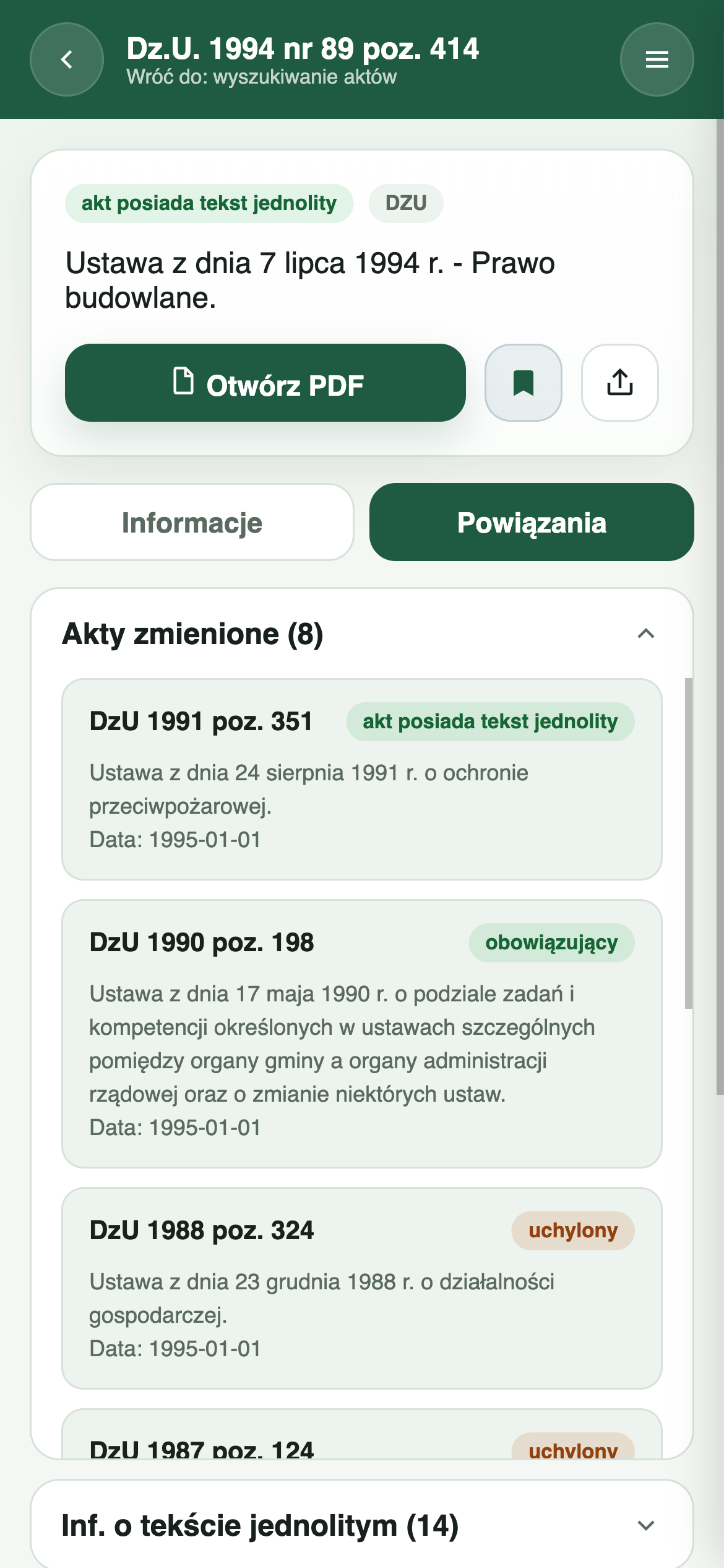Jedną z najważniejszych funkcji aplikacji jest zakładka Powiązania. To właśnie tam użytkownik może sprawdzić, jakie akty są związane z wybranym dokumentem. W praktyce pozwala to szybko przejść między: