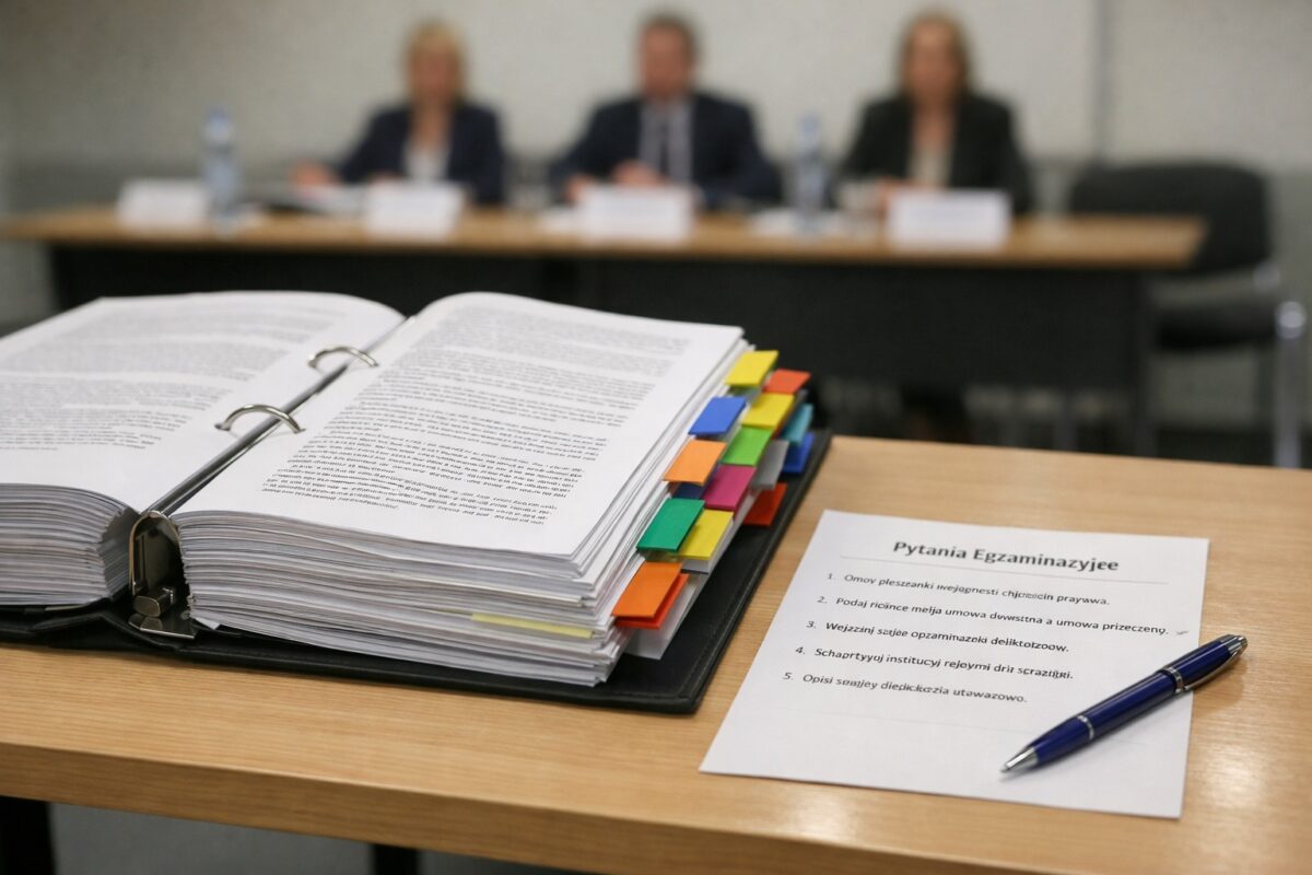 Dobrze zorganizowany segregator z czystymi, ujednoliconymi tekstami aktów prawnych, uzupełniony o spisy treści i czytelne zakładki — to Twoja najlepsza broń na egzaminie ustnym. Pamiętaj jednak, że żaden segregator nie zastąpi rzetelnej nauki. Materiały na sali służą do potwierdzenia i odnalezienia szczegółów, które już znasz — a nie do nauki od zera pod presją czasu.